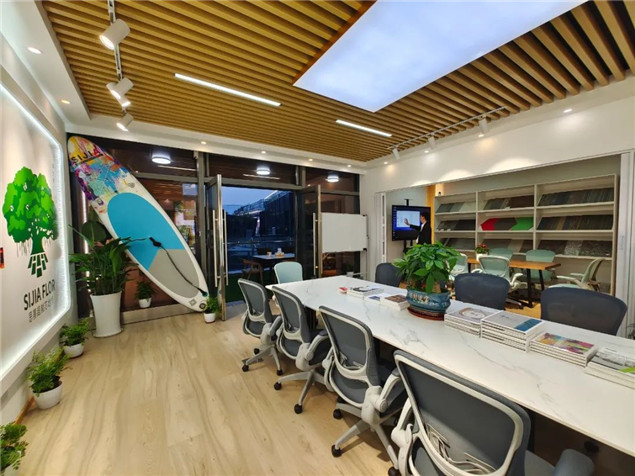 運營中心的內(nèi)部裝飾,充分融入品牌元素。采用思嘉超能芯鋪裝地面,以超能芯六邊形地板裝飾茶歇區(qū),以魚骨拼鋪法裝飾洽談區(qū),展現(xiàn)產(chǎn)品應(yīng)用效果,為自己代言。